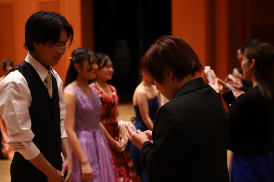 定期演奏会が始まる直前、音楽専攻・吹奏楽部の生徒と教職員が集まってミーティングが行われました。