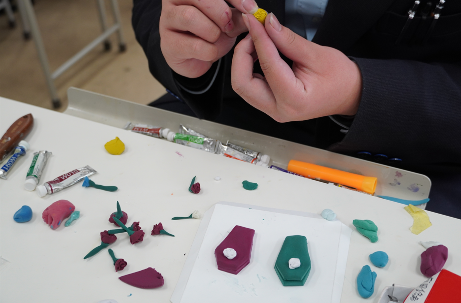 これまで学んだ技術を活かして、ただ描いたり、色を塗ったりするだけでなく、粘土なども使用して制作をしております。